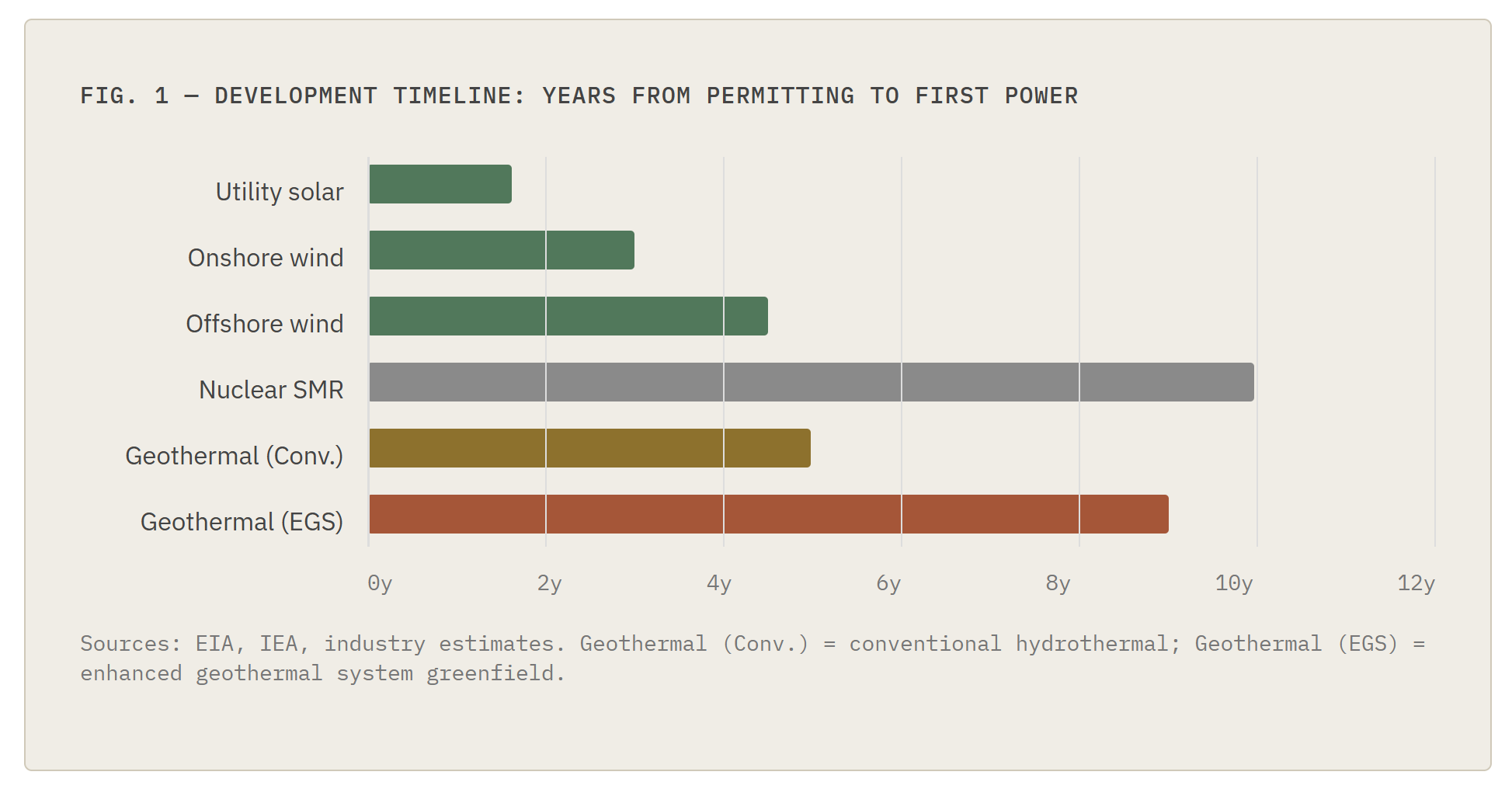 Consider the investment cycle. A conventional solar farm can move from permitting to power in 12 to 24 months. A wind project takes two to four years. A geothermal development — particularly a greenfield project — can take 7 to 10 years from initial resource assessment to first power. That timeline mismatch alone disqualifies geothermal from large categories of institutional capital that require shorter deployment windows and predictable return schedules.