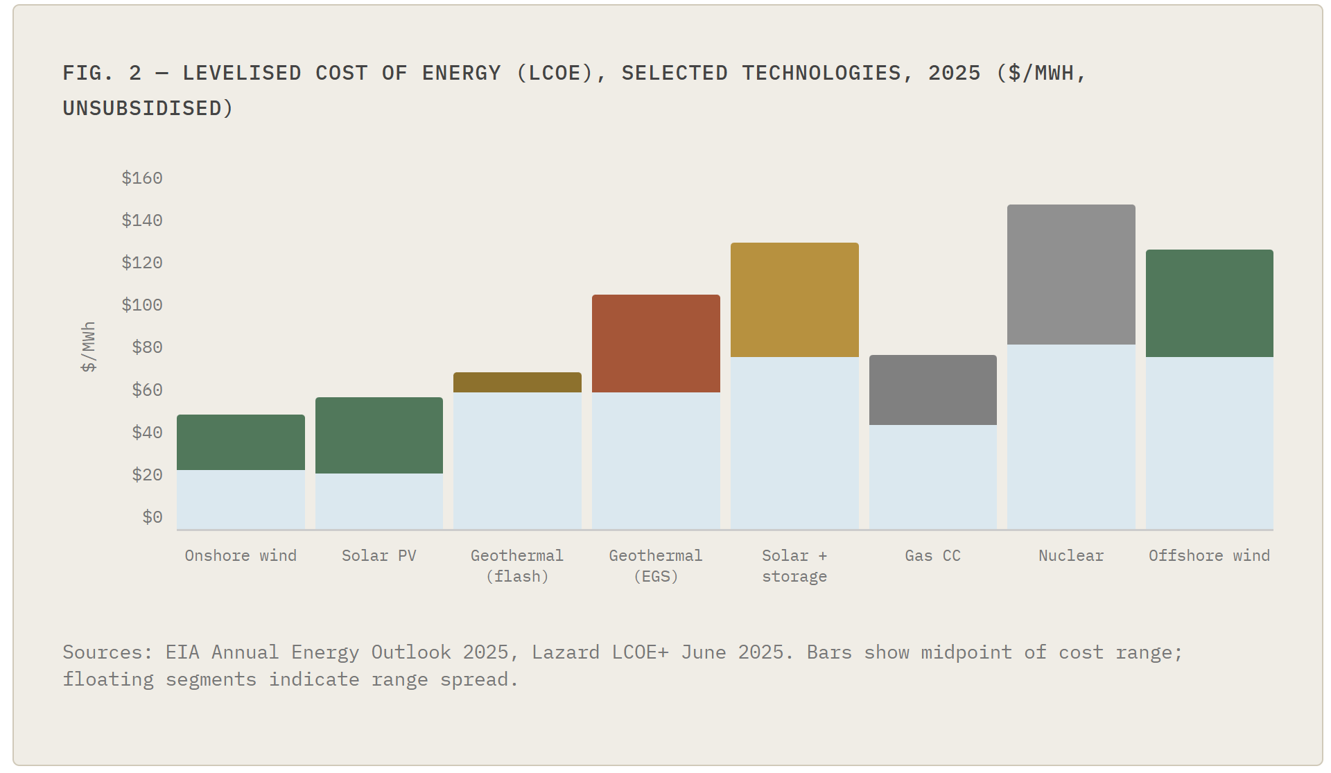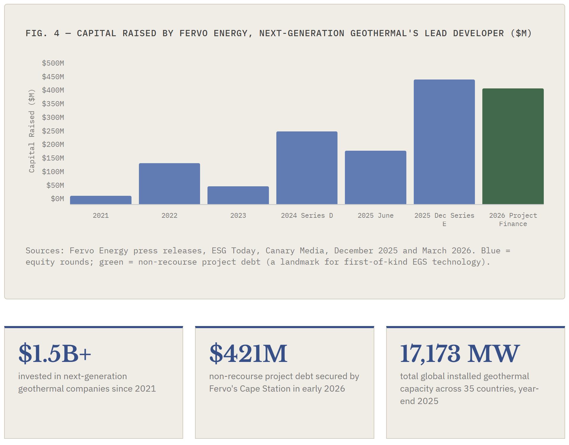 More than $1.5 billion has been invested in next-generation geothermal companies since 2021. The sector’s financing architecture is maturing: Fervo’s Cape Station project secured $421 million in non-recourse project debt in early 2026 — a landmark for a first-of-kind technology that signals the transition from venture-backed risk capital to institutional infrastructure finance. Lazard’s 2025 LCOE+ report explicitly identifies geothermal alongside SMR nuclear and long-duration storage as technologies that diverse, reliable future grids will require.