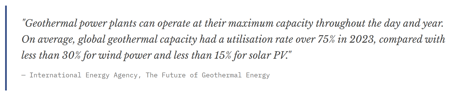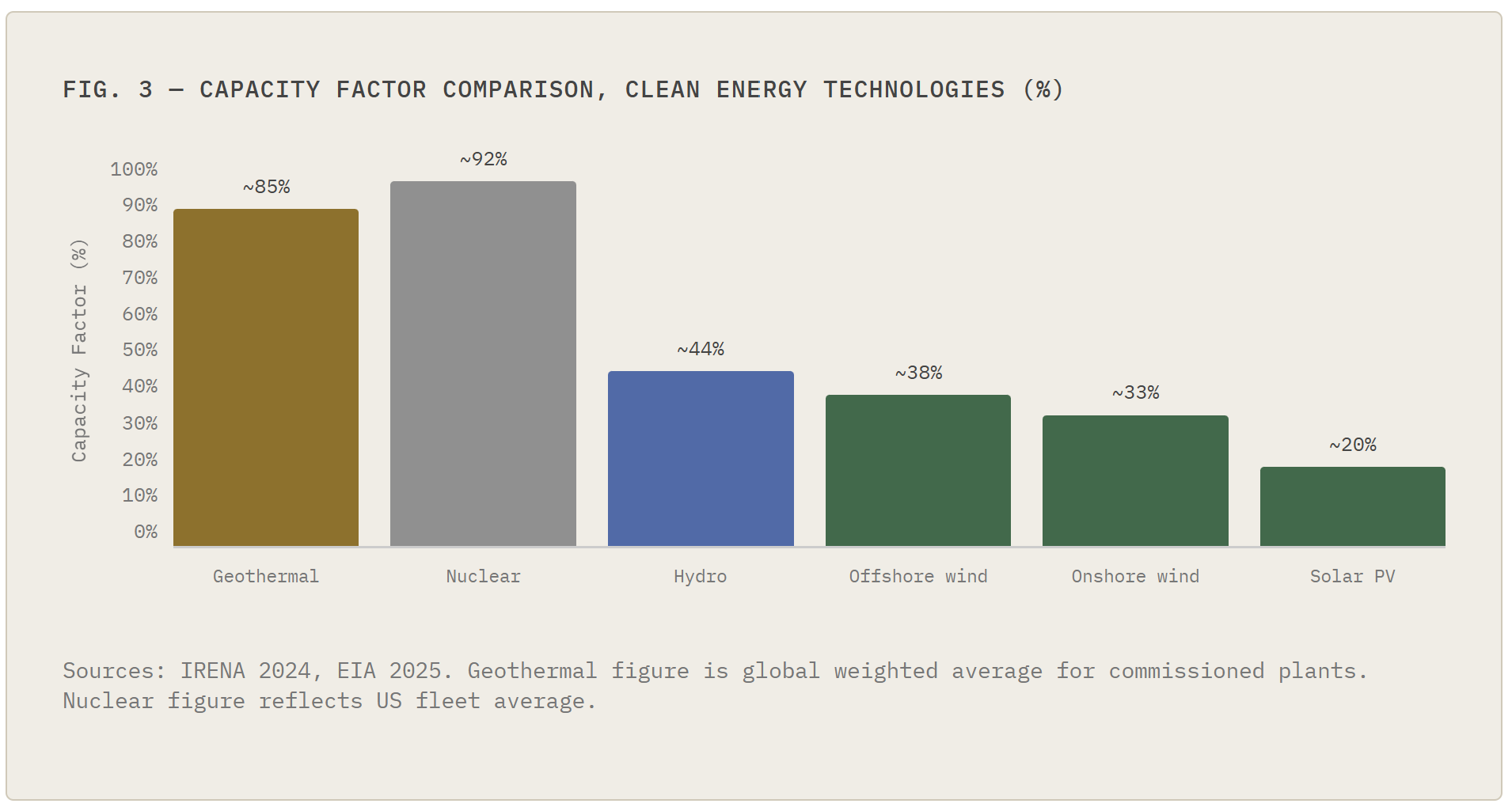 The correct comparison is geothermal against the full system cost of solar-plus-storage, where it is increasingly competitive. The capacity factor differential is stark: geothermal plants operate at 85–90%+ utilisation year-round versus 15–25% for solar and 30–40% for wind. Every dollar of installed capacity generates far more energy over the asset’s life — and commands higher capacity payments in markets that value firm, dispatchable generation.