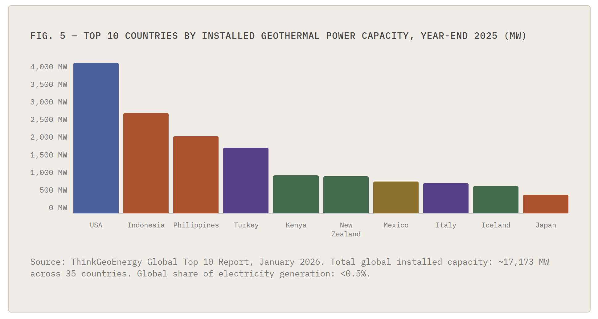 Sources: EIA Annual Energy Outlook 2025; Lazard LCOE+ June 2025; IEA, The Future of Geothermal Energy; ThinkGeoEnergy Global Top 10 Geothermal Countries, January 2026; National Laboratory of the Rockies, 2025 U.S. Geothermal Market Report; Fervo Energy press releases (June 2025, December 2025, March 2026); Climate Policy Initiative, Lessons on the Role of Public Finance in Deploying Geothermal Energy in Developing Countries; Norton Rose Fulbright, Geothermal Projects in East Africa; Rhodium Group, Enhanced Geothermal and Data Center Demand Analysis. All LCOE figures in 2024 USD unless stated. This document is prepared for informational purposes only and does not constitute investment advice.