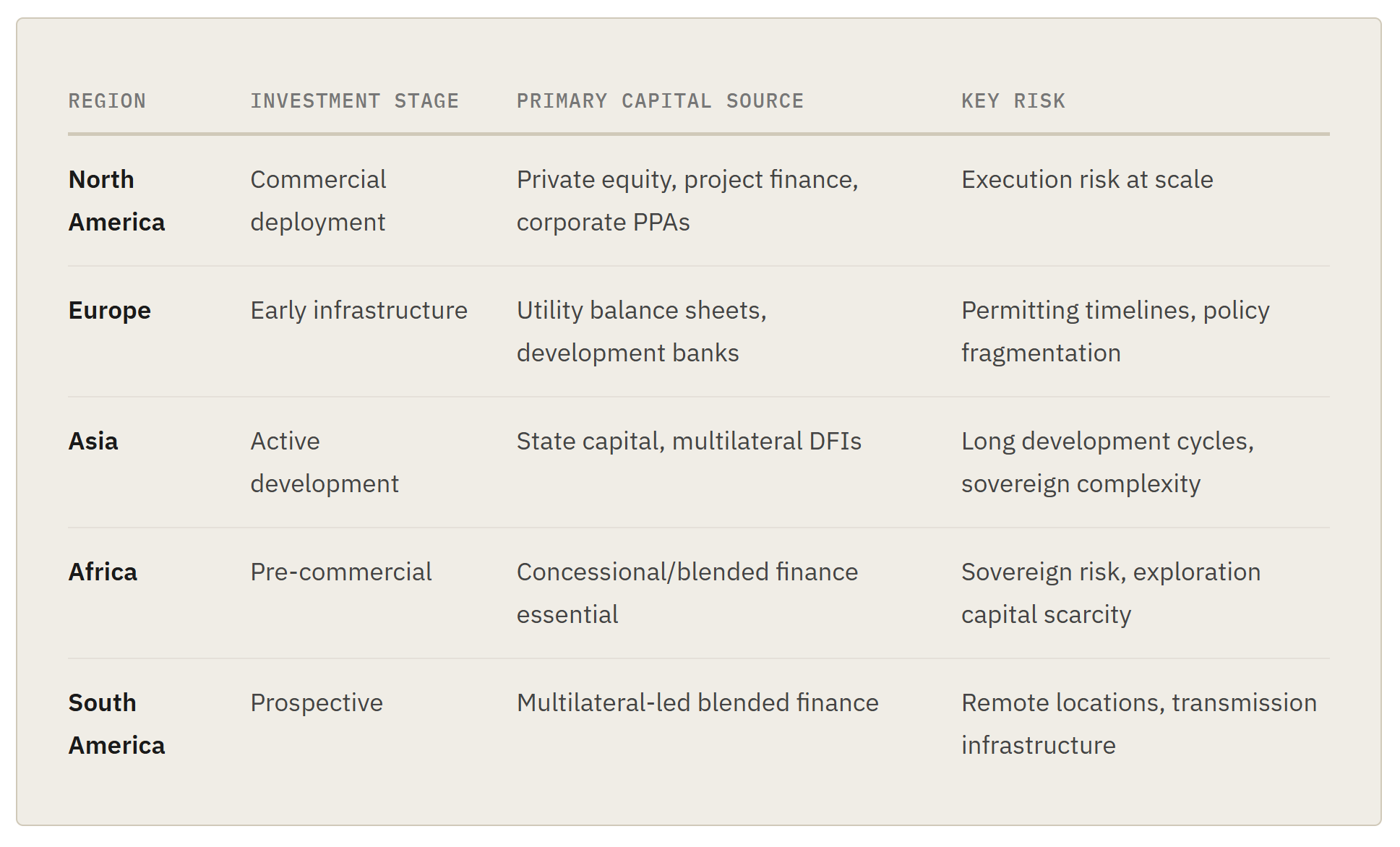 Europe’s geothermal story is predominantly direct heat — decarbonising district heating networks currently running on gas. Turkey leads with nearly 1,800 MW of installed power capacity and three new plants commissioned in 2025 alone. The broader EU faces permitting timelines of five to eight years and a fragmented regulatory landscape. For investors, European geothermal is best framed as a long-dated infrastructure position: low risk once operating, predictable revenues, and a structural decarbonisation mandate that only grows stronger. The challenge is getting projects through the high-risk exploration phase in a regulatory environment that lacks the risk-sharing instruments other markets have built.