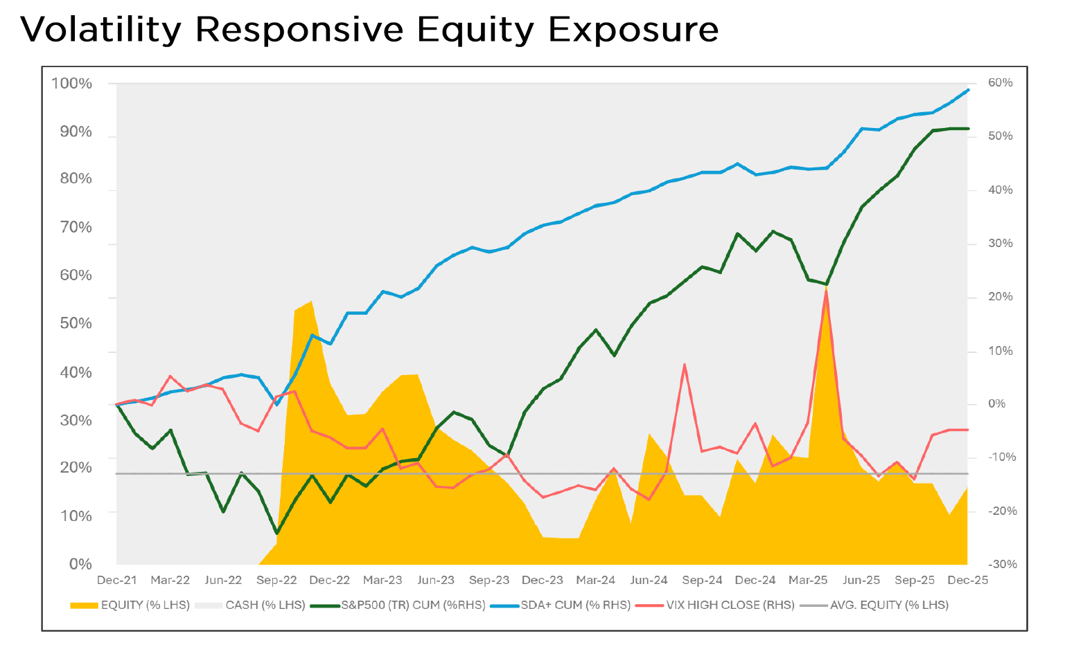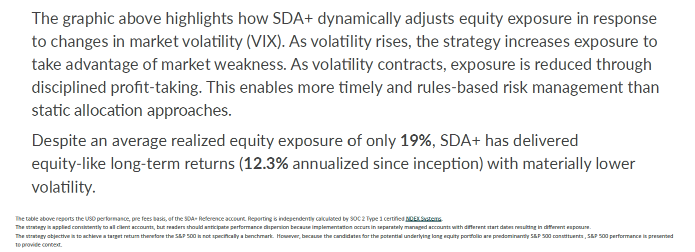 – Consequently there is no fixed minimum equity exposure for SDA+. Permitted range is from 0% to 135% long-equity. Historical maximum long equity exposure is 59.4%, minimum is 0%, and average is 19% (see Volatility Responsive Equity Exposure chart below).