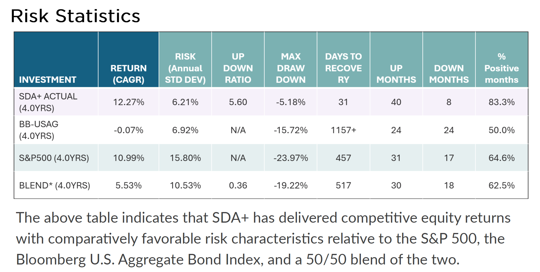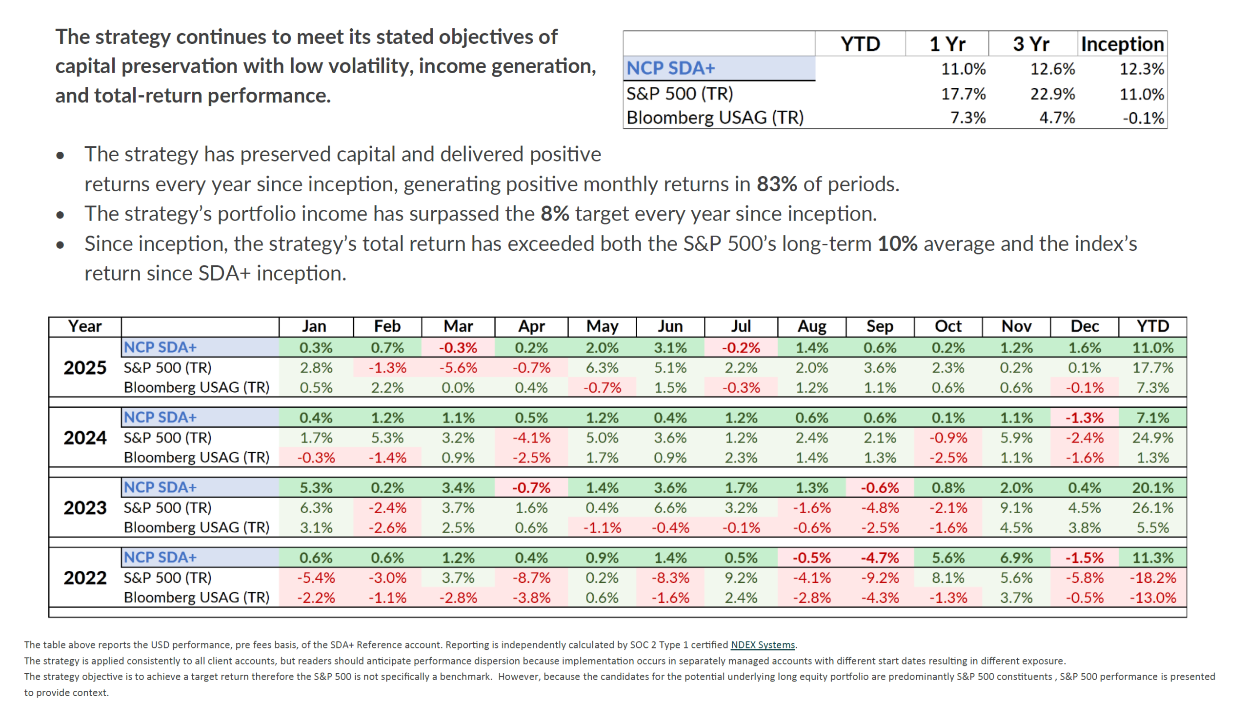 Sustainable Dividend Achievers+ (SDA+) is a target return strategy designed to deliver capital preservation with low volatility, reliable high income and growth.